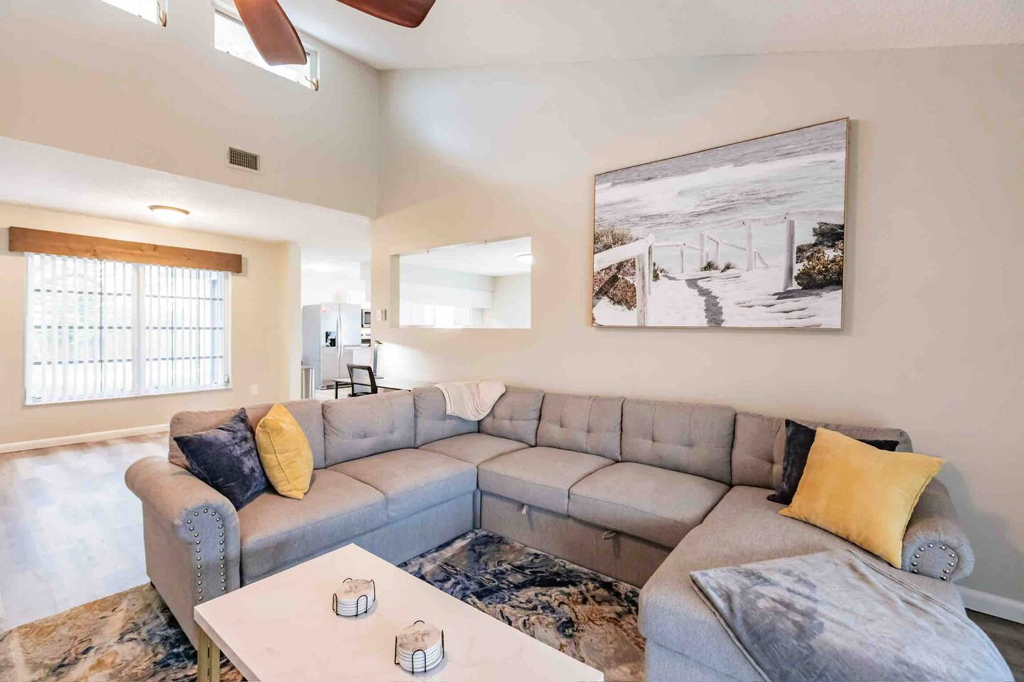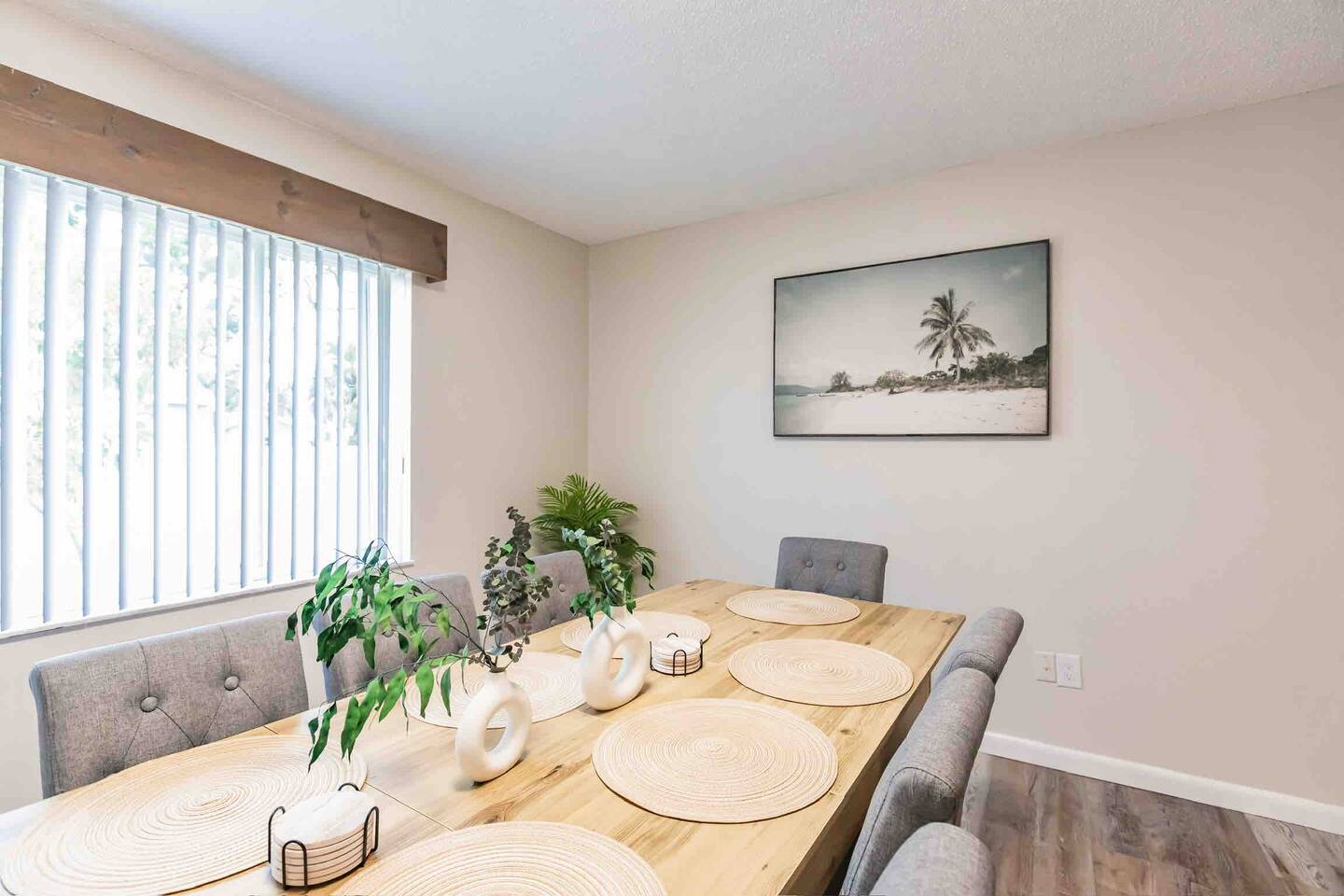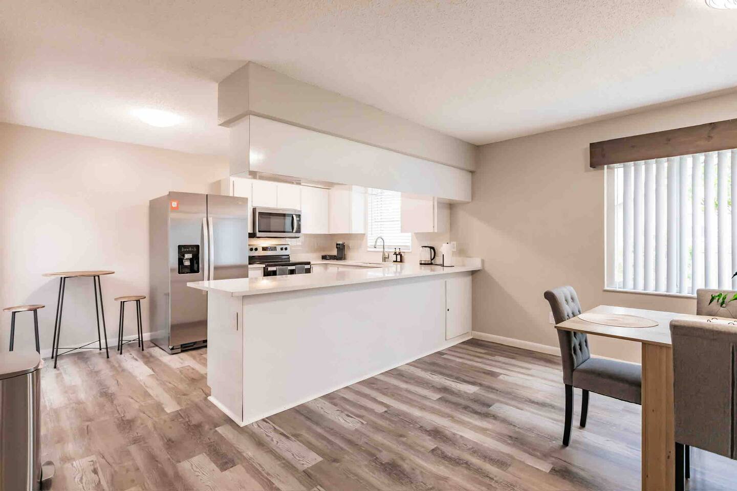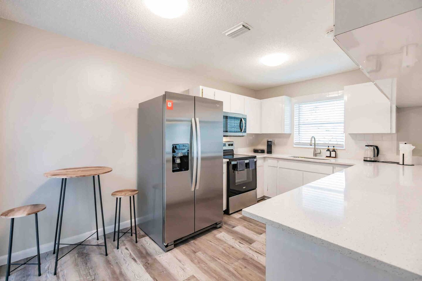 Experience comfort and style in our newly renovated 3-bedroom, 2-bath home featuring a spacious living and dining room. Our home includes a refreshing pool, lush backyard, and a fully stocked kitchen. Bed sizes are: 1 king, 1 queen and 2 full.